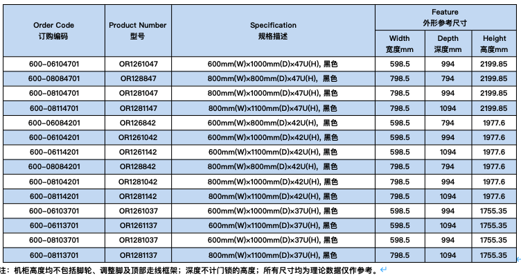 OR12系列机柜适用于各类机房环境的使用,主要为计算机、服务器、网络交换、UPS等电子设备提供全面可靠的保护。机柜各部件的材质均为优质冷轧钢板,采用先进工艺和全数控设备制成。机柜主体框架由四根立柱与上部顶盖围框和下部基础围框通过8个铝合金铸件和高强度的螺钉连接而成,保证机柜具有出色的承载能力和稳定性。OR12系列机柜具有适用性和兼容性强的特点。Dell、IBM、Inspur、Cisco等各种主流品牌的服务器均可安装在机柜内,同时兼容各种品牌的无源装置以及PDU等。